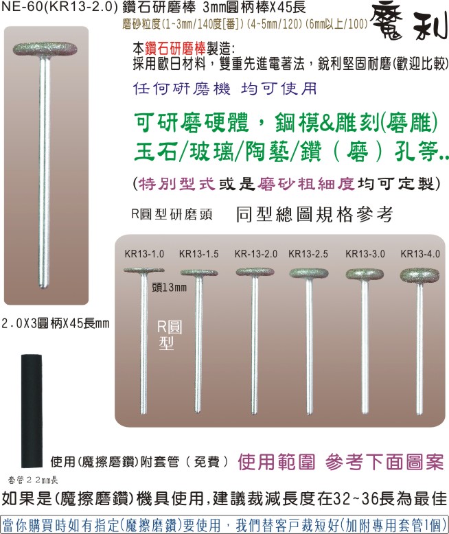 鑽石研磨棒,R13-2.0mm頭,電動研磨機/鑽石砂輪 (台製外銷) NE-60(KR13-2.0)