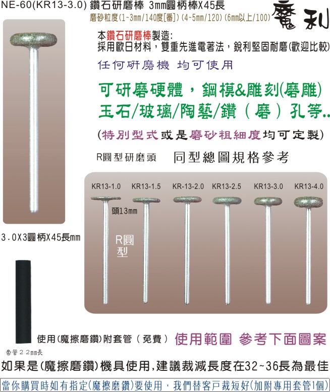 鑽石研磨棒,R13-3.0mm頭,電動研磨機/鑽石砂輪 (台製外銷) NE-60(KR13-3.0)