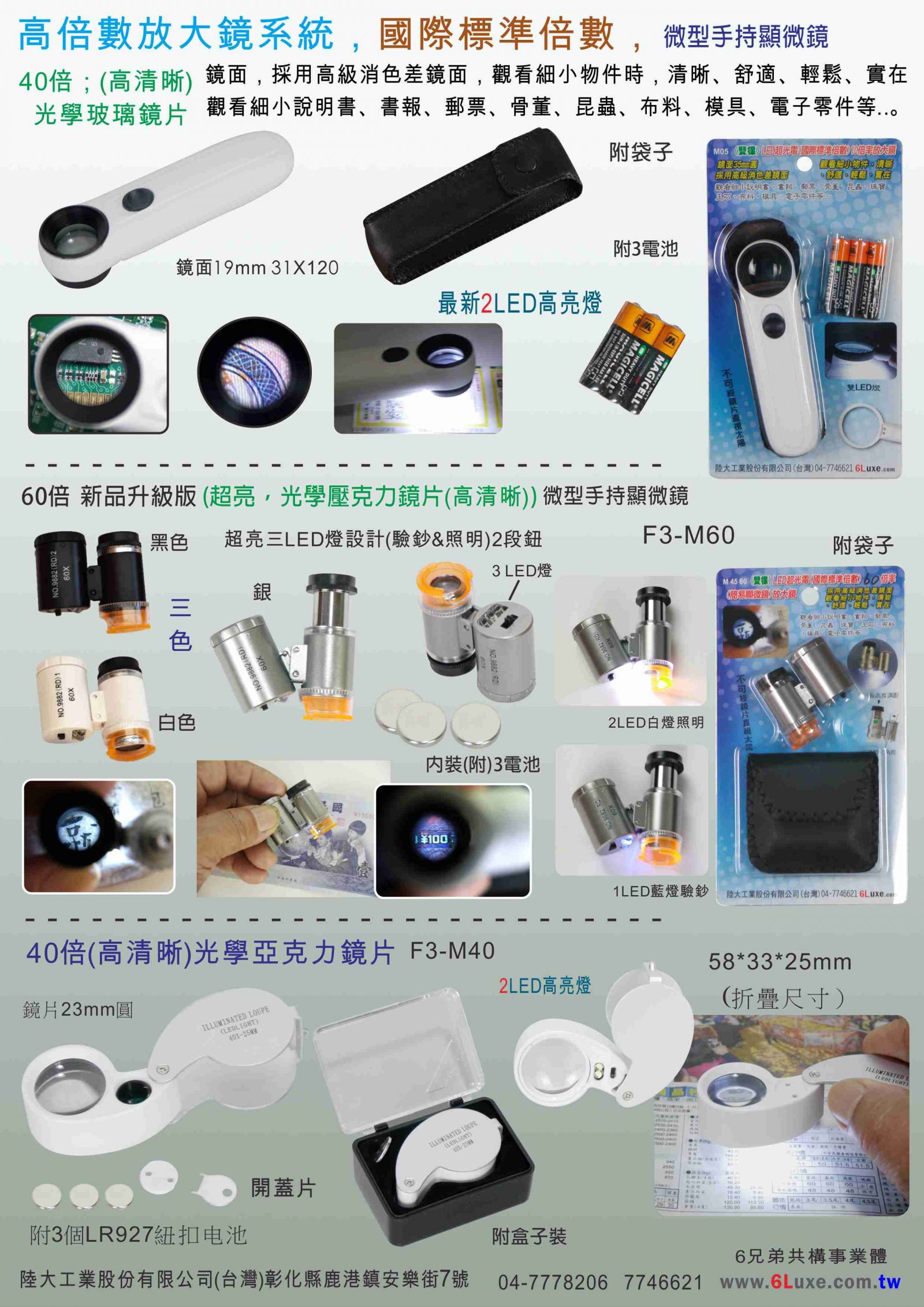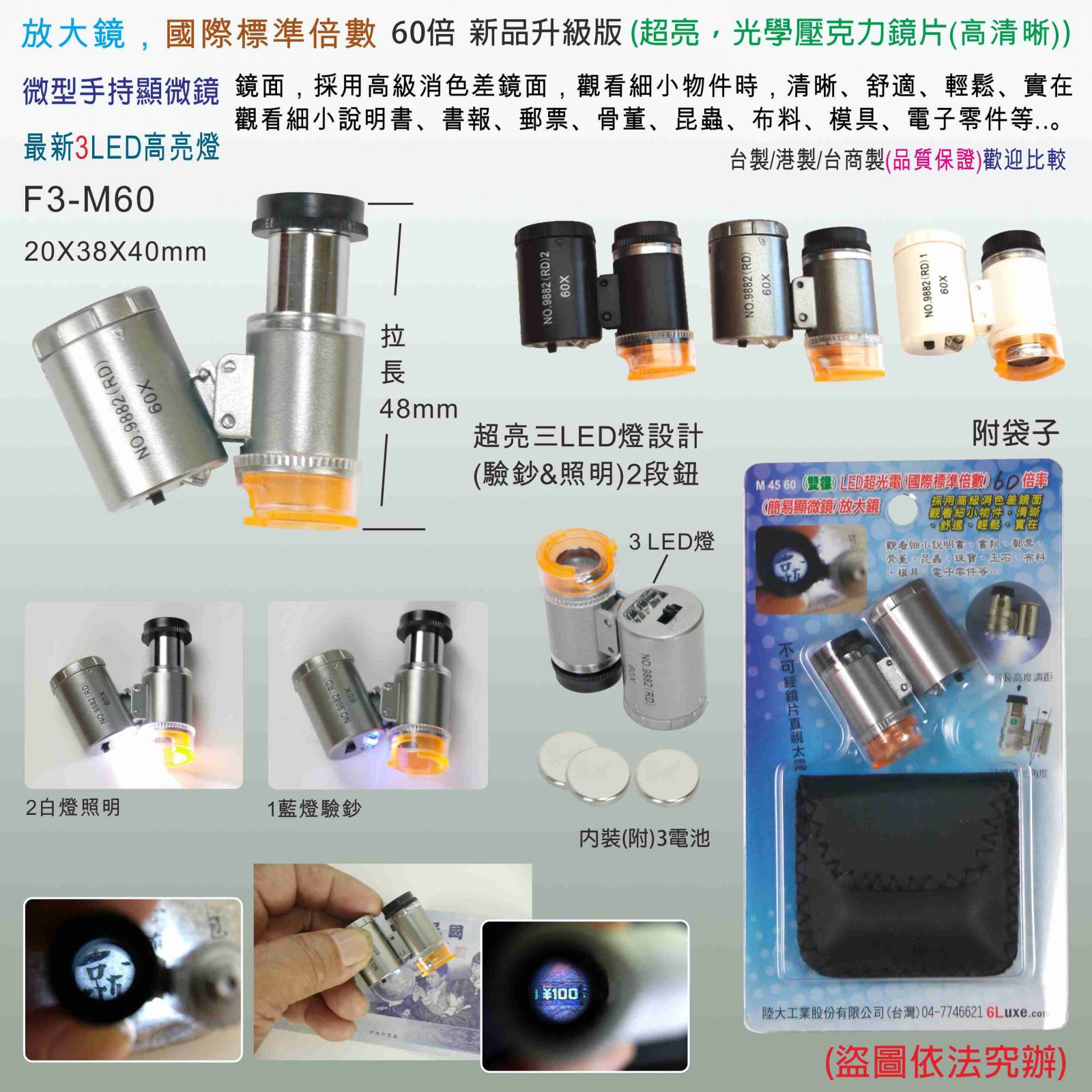 最新升級型 (3LED燈+ 1藍色驗鈔燈) 標準60倍微型手持顯微鏡/驗珠寶鏡, (光學壓克力鏡片(高清晰)F3-M60