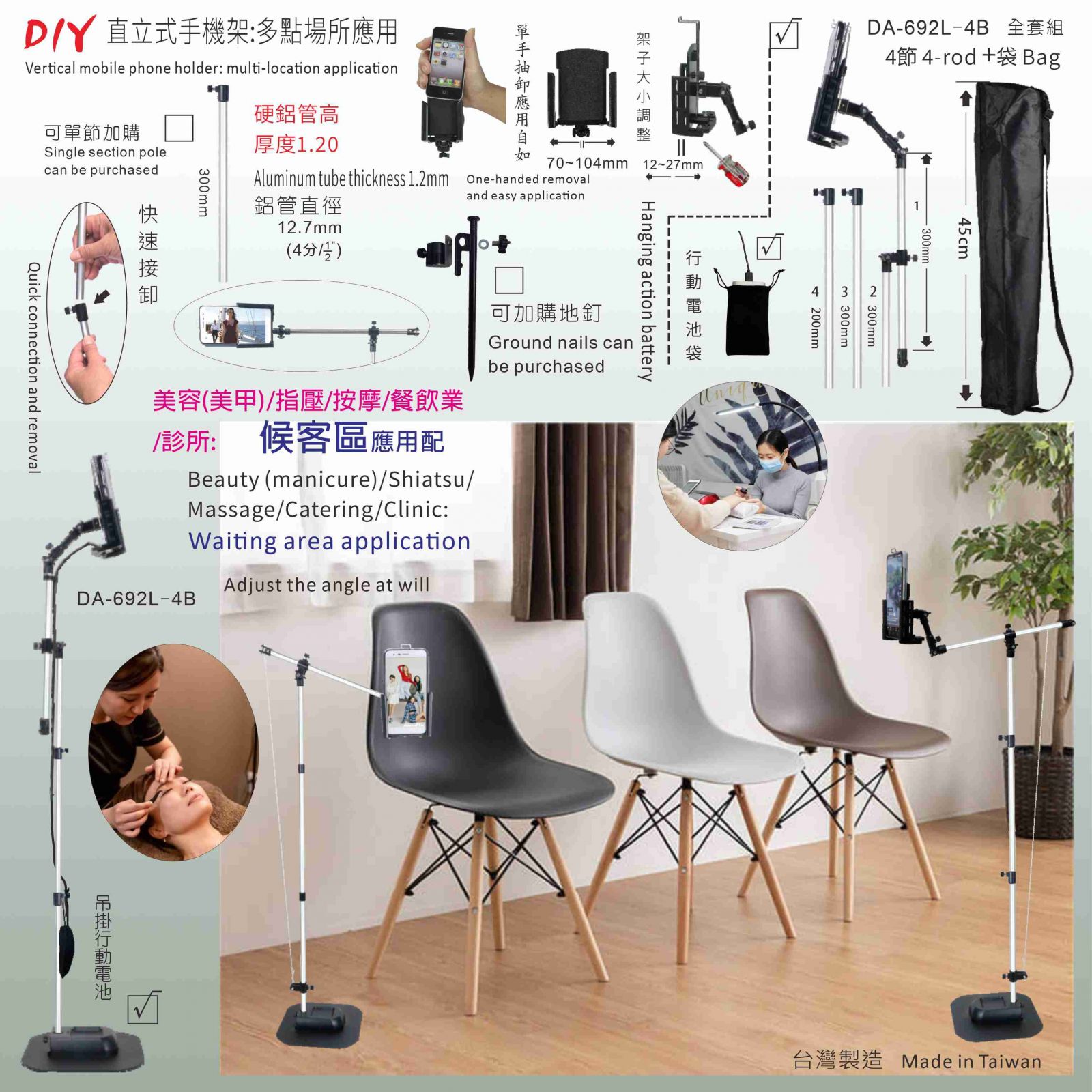 (多場所通用)主架4節+基座+行動電源應用吊掛袋+收納袋 鋁製外銷高級型680.-(30天/特價460)