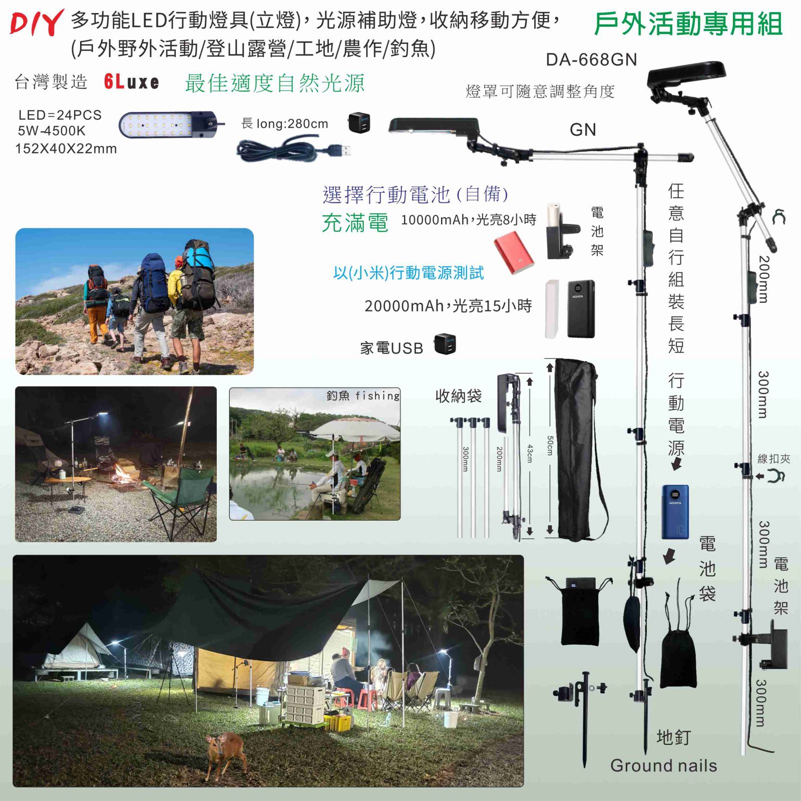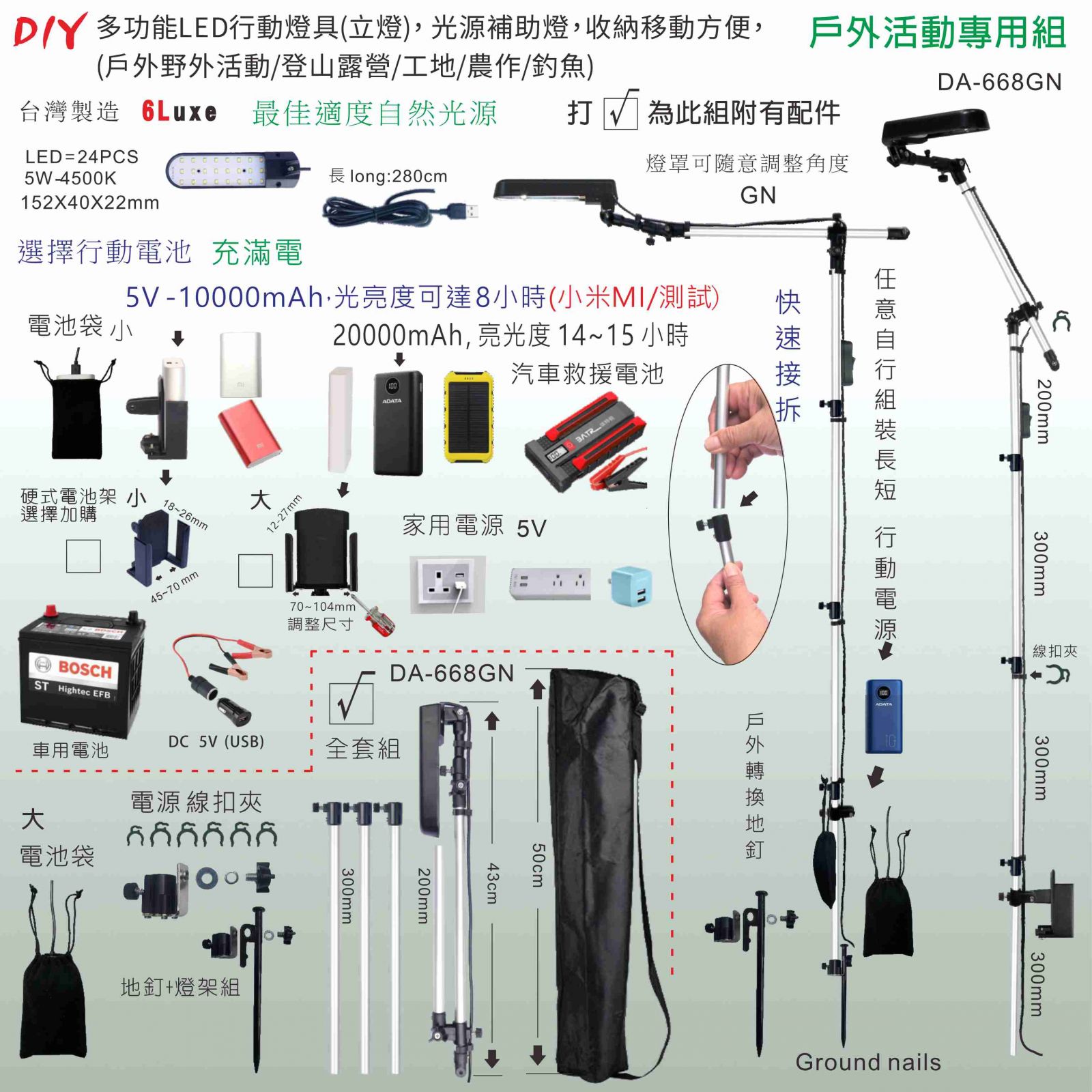台灣製造,售價980.-,新創(多國專利)外銷產品,新上架30天,特價650.- 使用1顆20000mAh行動電源-亮光15小時 / 10000mAh-亮光8小時 此組:附(5節桿)主燈+地釘組+行動電池納袋子,(無座盤,可另加購) 環保設計,可增購所需配件&損壞更換物件