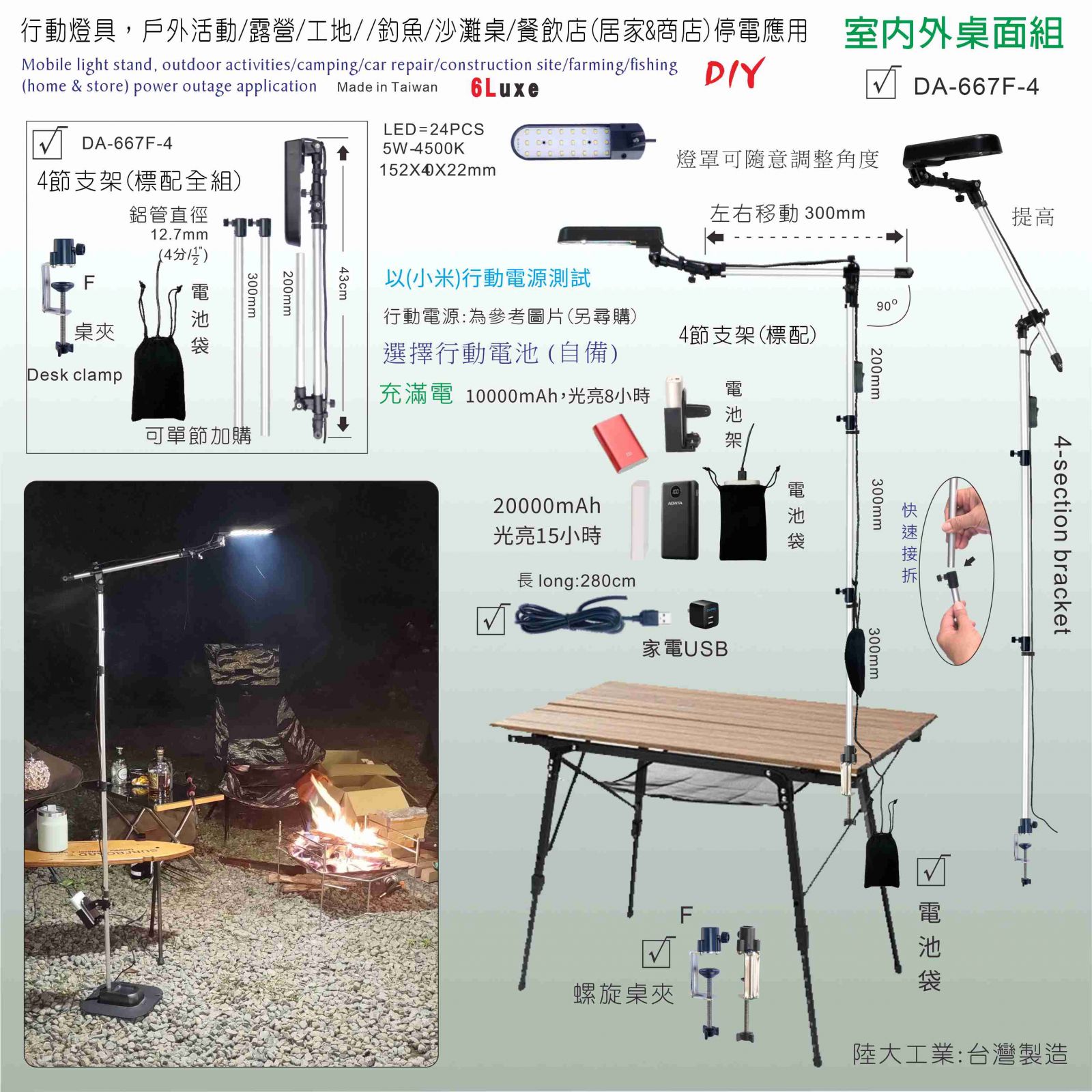 台灣製造,售價680.-,新創(多國專利)外銷產品,新上架30天,特價420.- 使用1顆20000mAh行動電源-亮光15小時 / 10000mAh-亮光8小時 此組:(4節桿)主燈+桌夾+行動電池袋子。 環保設計,可增購所需配件&損壞更換物件