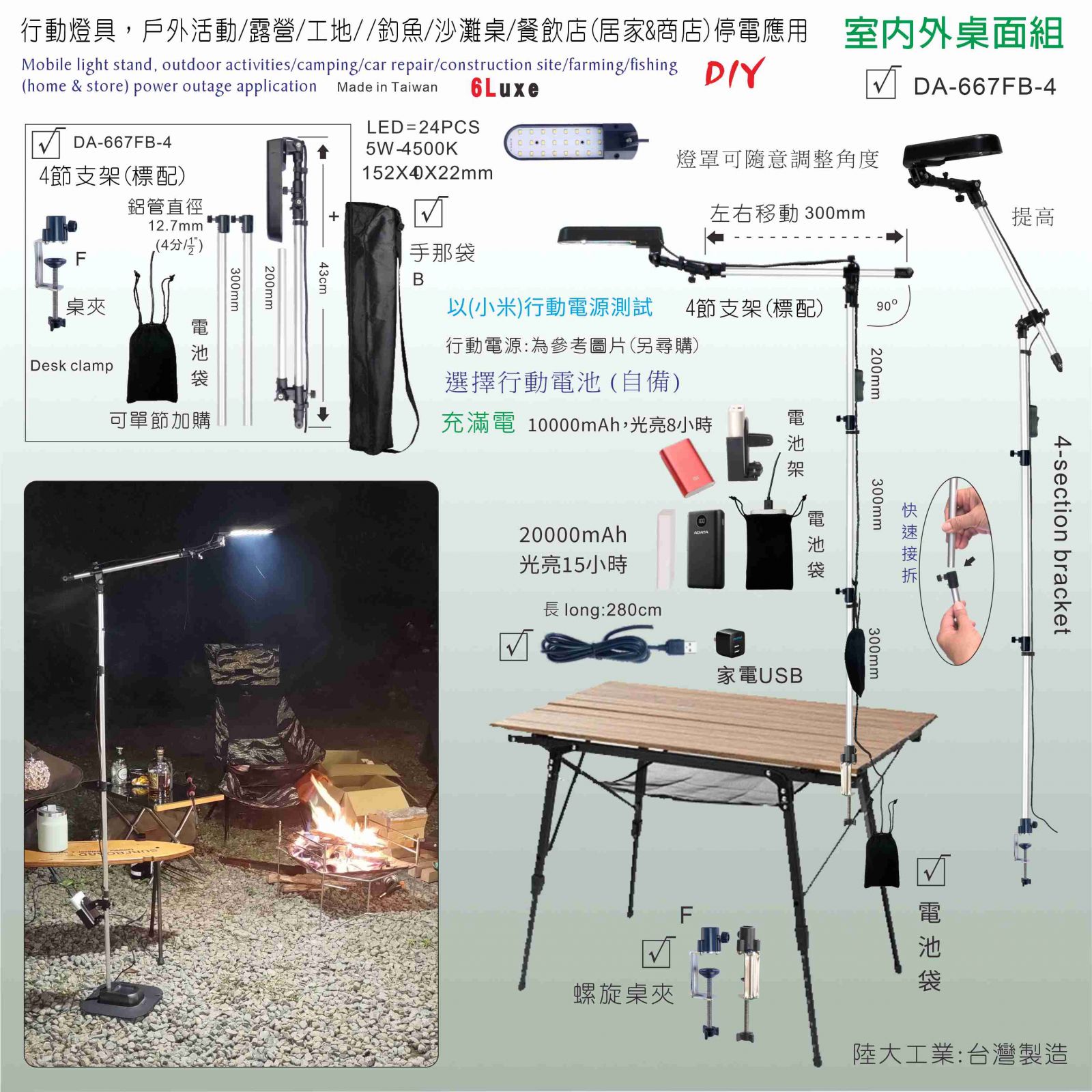 台灣製造,售價780.-,新創(多國專利)外銷產品,新上架30天,特價460.- 使用1顆20000mAh行動電源-亮光15小時 / 10000mAh-亮光8小時 此組:(4節桿)主燈+桌夾+行動電池袋子+收納袋。 環保設計,可增購所需配件&損壞更換物件